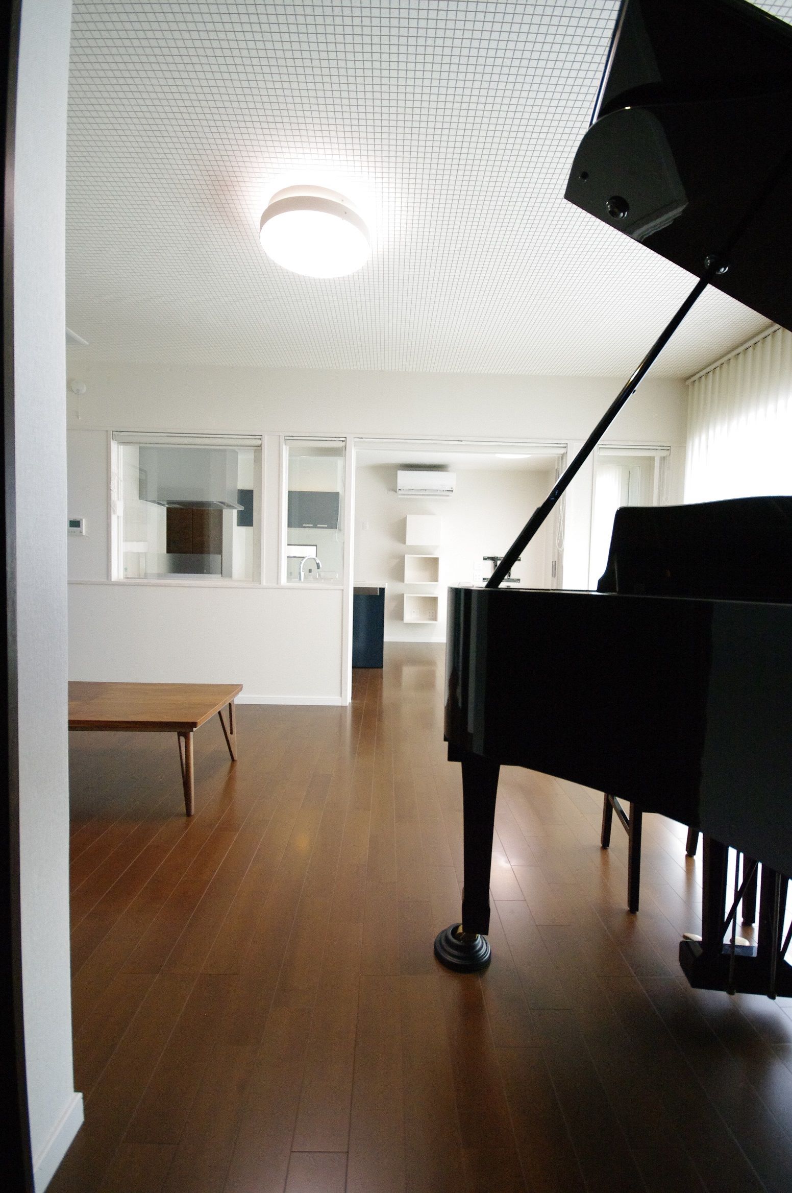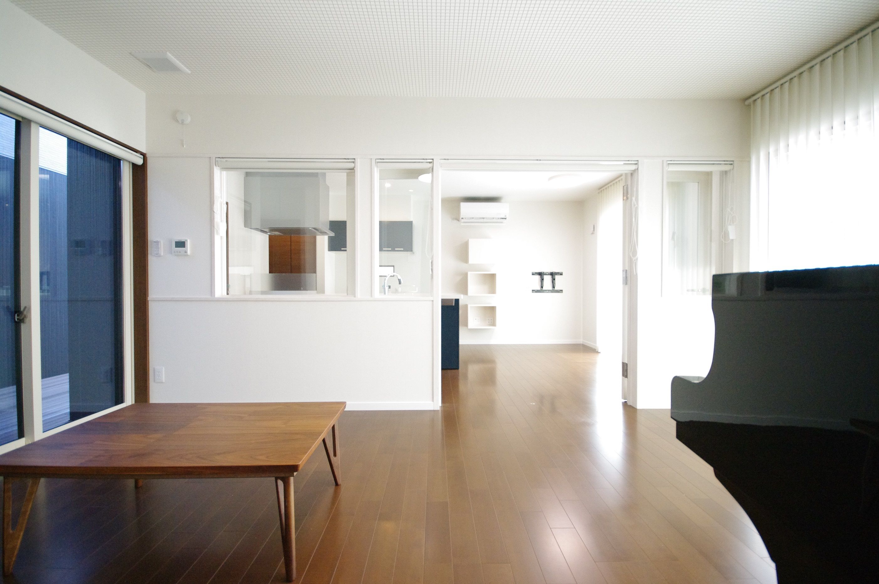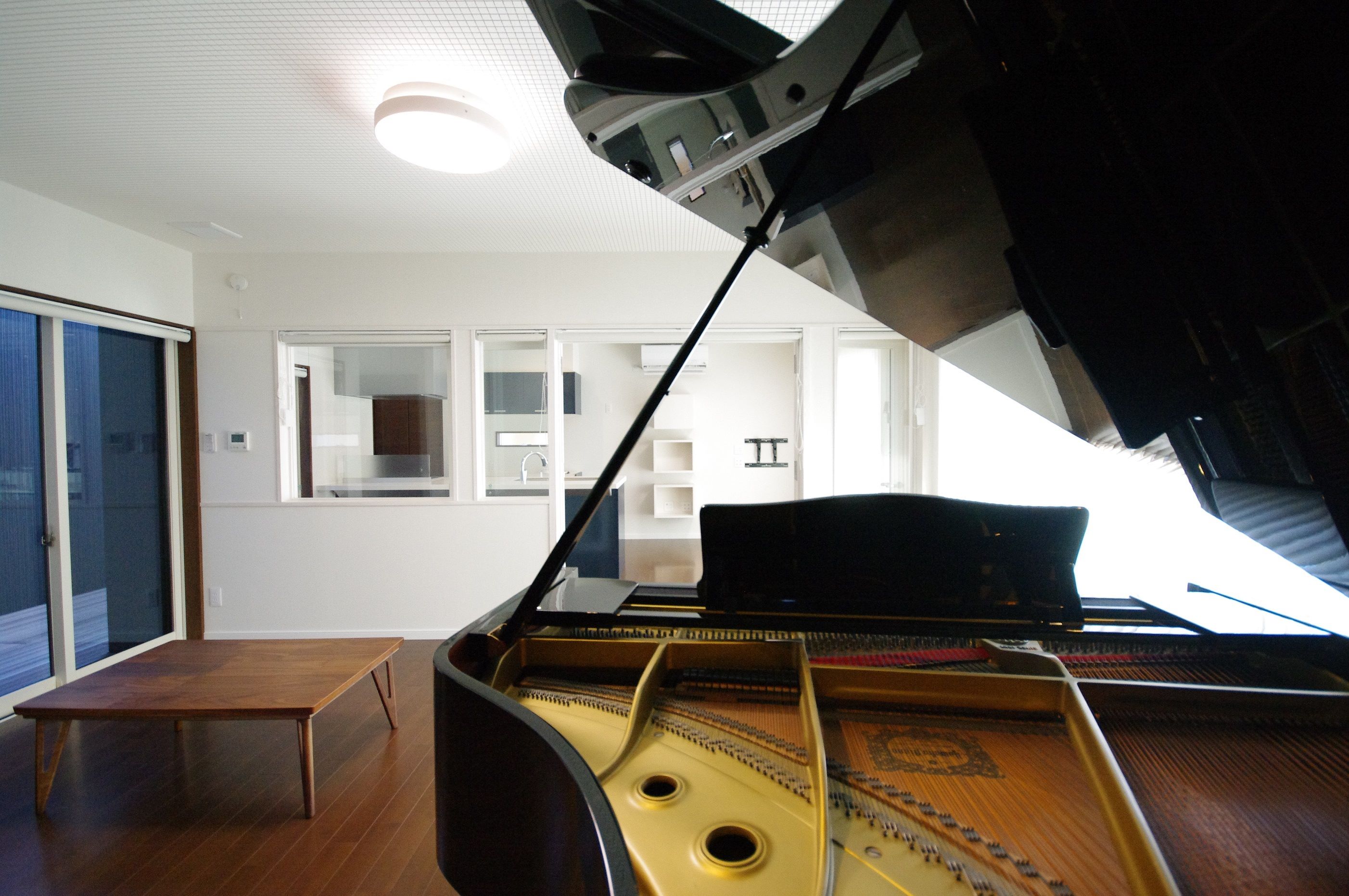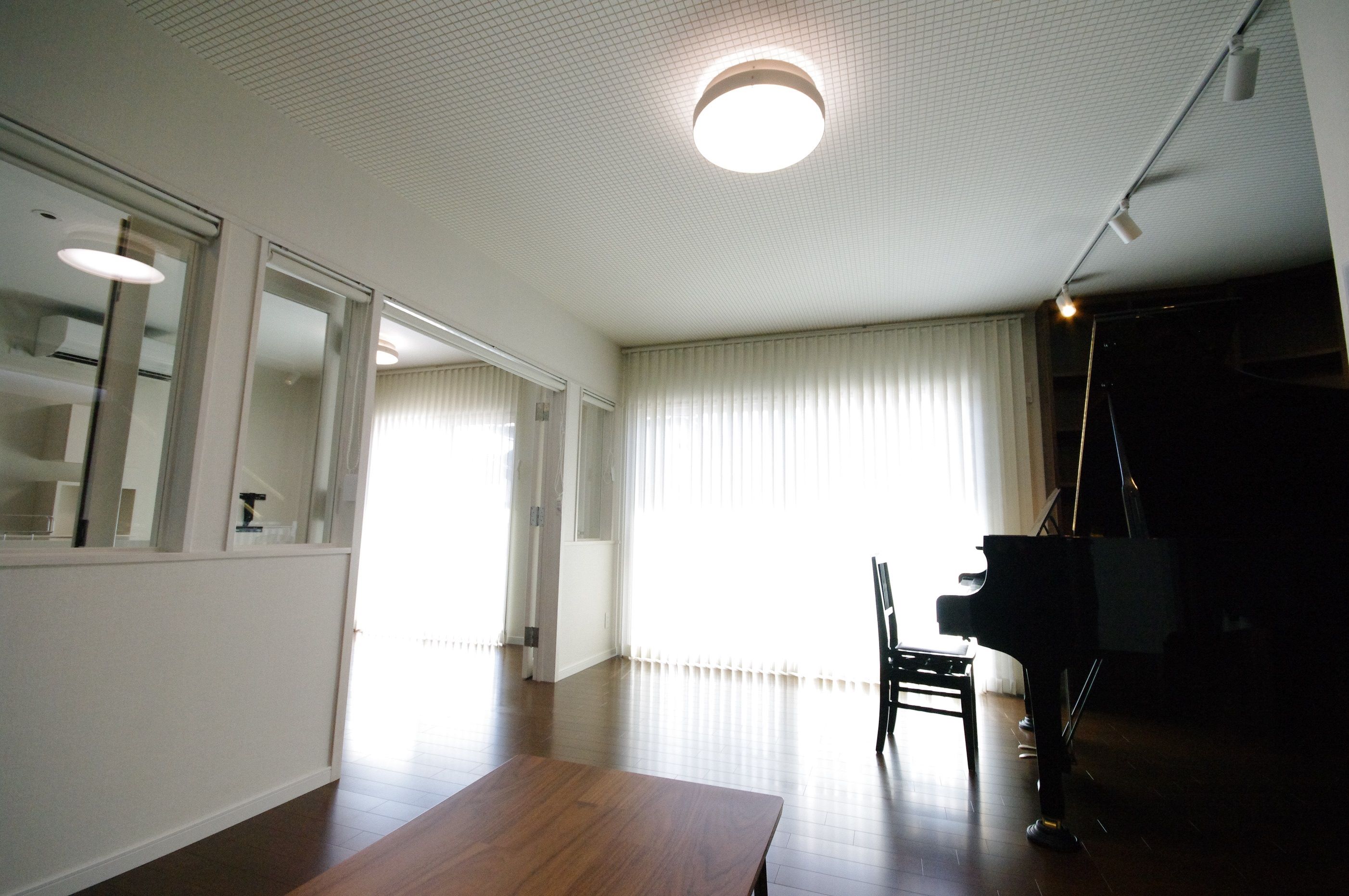 風が抜け太陽光が降り注ぐ明るいグランドピアノがあるリビング